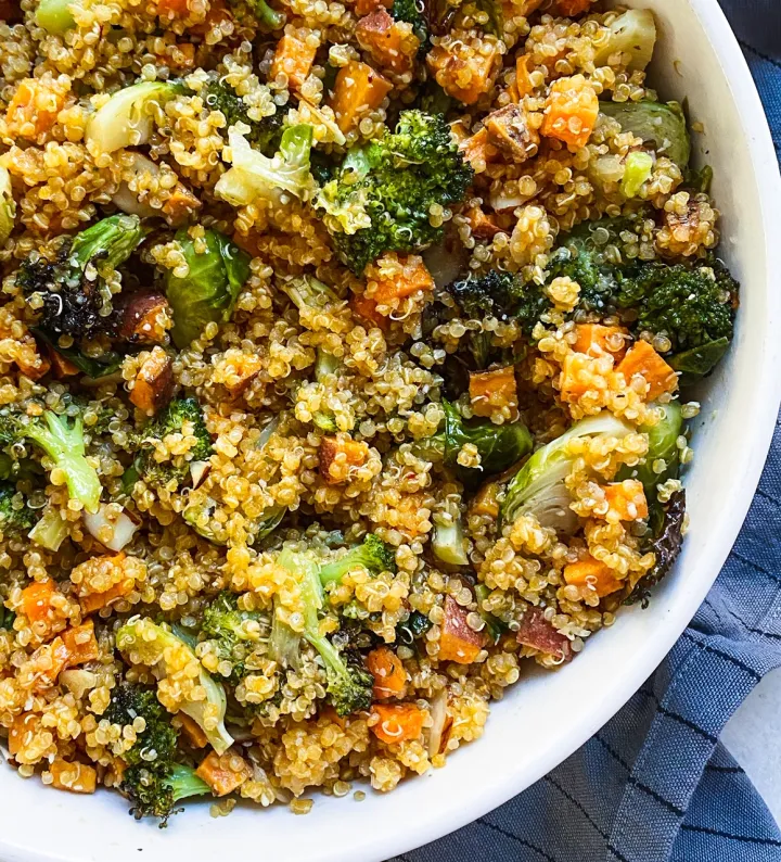 Quinoa is a complete protein that helps repair tissues and maintain muscle mass. The grilled veggies add antioxidants like vitamin C and polyphenols, while the olive oil and herbs provide omega-rich anti-inflammatory benefits.