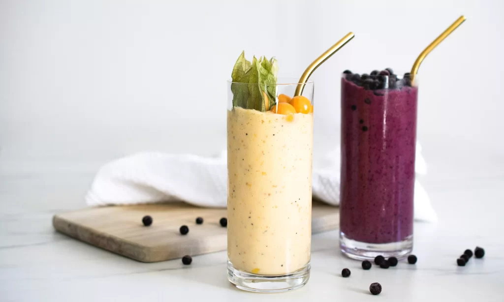 Blend frozen berries, banana, and oat milk. Top with granola, chia seeds, and fresh fruits for crunch and energy.