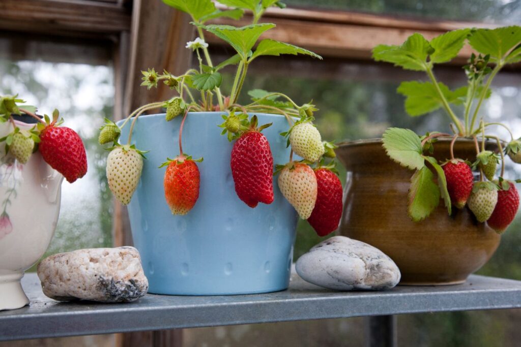 Strawberries can be planted in garden beds, boxes, or containers: